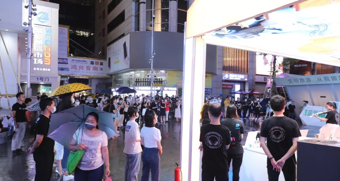 晚上7時(shí)30分,精彩的小提琴表演正式開始,隨著靈動(dòng)的琴聲響起,絢爛的燈光下,為雨夜增添了些許浪漫,瞬間吸引了眾多游客駐足觀看,一曲琴音落,博得現(xiàn)場(chǎng)眾多掌聲與喝彩。