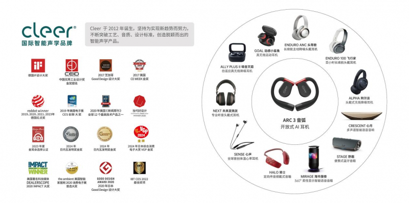 這一匠心在旗下國際智能聲學(xué)品牌Cleer身上更是開花結(jié)果。從真無線耳機(jī)到開放式AI耳機(jī),Cleer憑借出色的設(shè)計(jì)和優(yōu)異的音質(zhì)表現(xiàn),屢獲全球大獎(jiǎng),至今已榮獲超過60項(xiàng)國際權(quán)威設(shè)計(jì)和創(chuàng)新獎(jiǎng)項(xiàng),包括美國Good Design獎(jiǎng)、CES創(chuàng)新大獎(jiǎng)、中國當(dāng)代好設(shè)計(jì)獎(jiǎng)、德國紅點(diǎn)設(shè)計(jì)獎(jiǎng)以及IF設(shè)計(jì)大獎(jiǎng)。