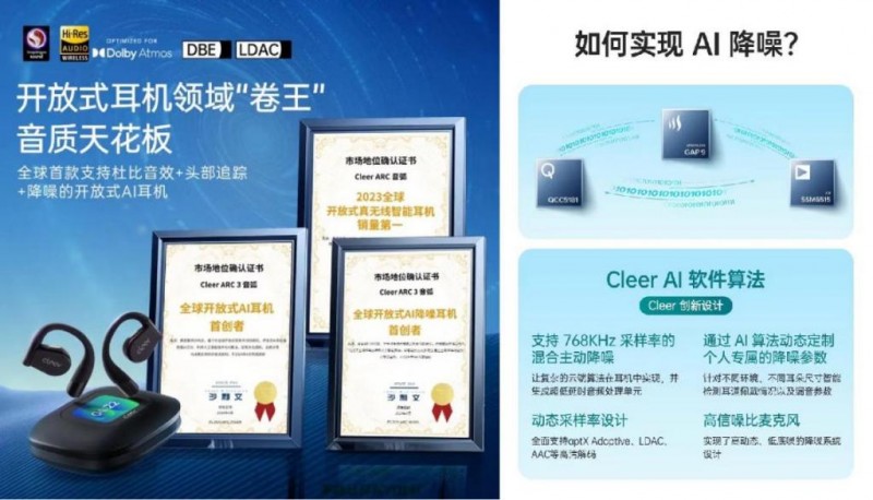此外,Cleer ARC 3 音弧的“新”,“新”在AI。與傳統(tǒng)耳機(jī)不同的是,Cleer ARC 3 音弧是全球首款開放式AI耳機(jī)。這意味著它除了具備除了“大師音質(zhì)”外,還擁有著令人驚喜的AI語音控制、AI體感操控、AI聲境恒聽等六大AI功能。