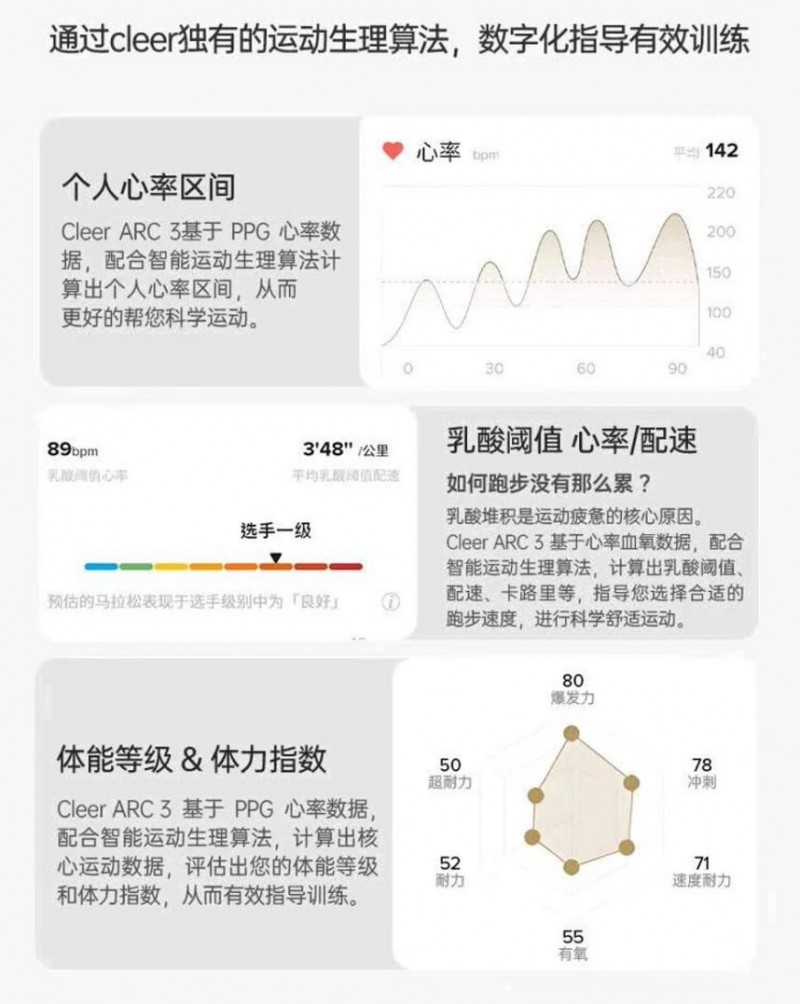 Cleer與全球頂尖專業(yè)運(yùn)動(dòng)科學(xué)及AI智能教練服務(wù)商——GoMore緊密合作,共同為ARC 3 音弧 運(yùn)動(dòng)版Pro搭載了包括個(gè)性化心率區(qū)間、有氧關(guān)鍵指標(biāo)、能量消耗等一系列綜合性算法。不僅有助于準(zhǔn)確評(píng)估運(yùn)動(dòng)能力,還能實(shí)時(shí)監(jiān)測(cè)訓(xùn)練成效,為用戶提供更加科學(xué)合理的訓(xùn)練計(jì)劃。